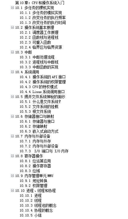 按照这个顺序,从最底层到最上层,整个嵌入式知识体系也就搭建完成了。如果你是非计算机专业的学生,甚至是非电类的学生,不知道半导体工艺、不知道CPU的工作原理、不知道程序是怎么编译、安装和运行的、不知道C语言的模块化编程、多任务编程、面向对象编程思想。读了这本书可以补齐所有的理论短板和知识盲区。书稿大纲如下: